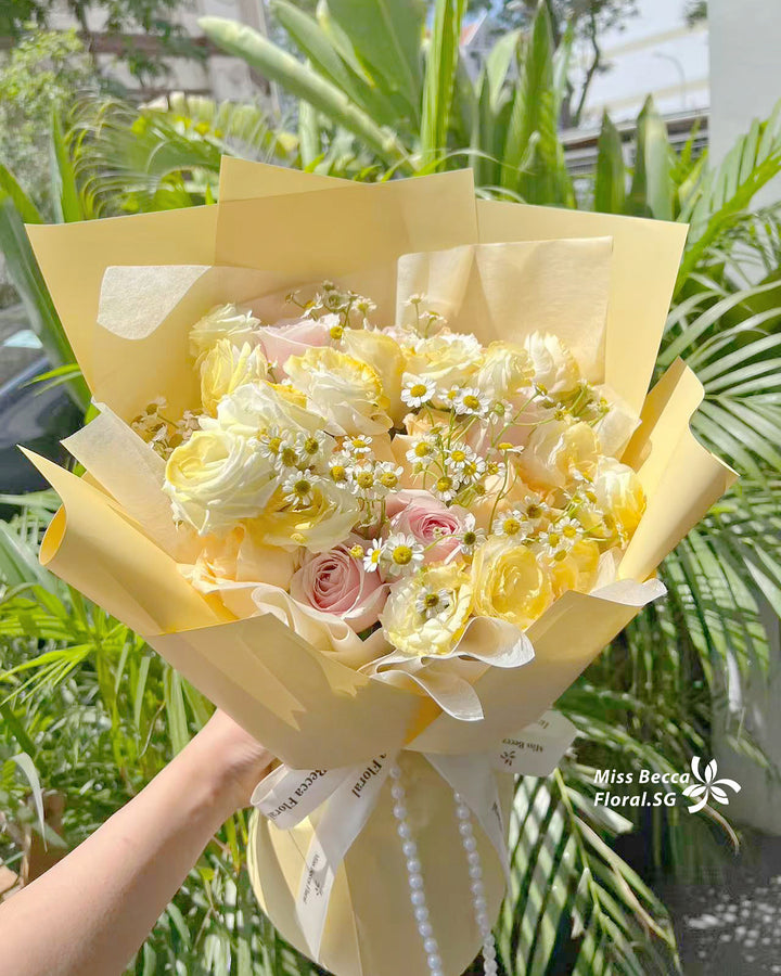 Korea style pink rose with yellow spray eustoma fresh flower bouquet